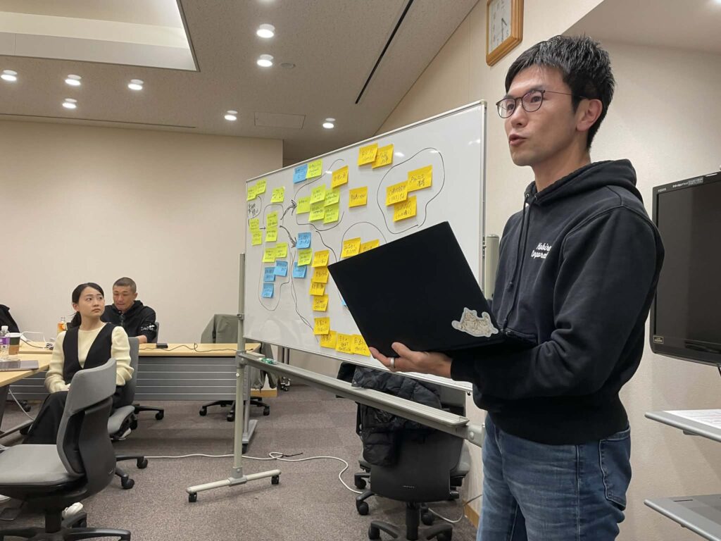 ↑ ホワイトボードを写真に撮り、それをAIに読み込ませ、10分間のプレゼン内容を作り、それを参考に発表する河合さん。